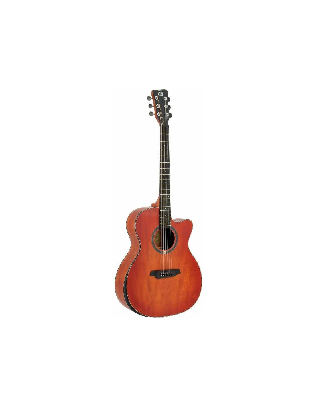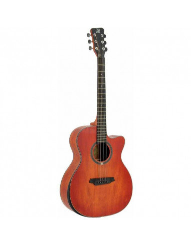 Guitarra electroacústica con cutaway tipo OM. Sistema confort para mayor comodidad. Tapa laminada de picea. Aros y fondo de sapelly. Puente y diapasón de 'compound rosewood'. Clavijeros cerrados. Cuerdas D´Addario. Acabado mate cherryburst.